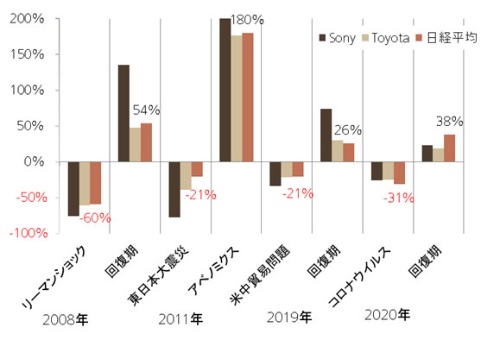 上の図を見てください。ソニー、トヨタ、日経平均の増減率を、過去の株式相場の下落局面と回復期とで並べたものです。コロナ禍の時よりもリーマン・ショックのほうが、下げ幅ははるかに大きかったのですね。