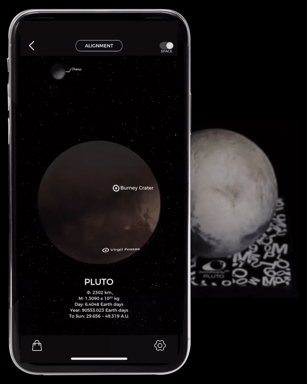 AstroReality PLUTO Classicは無人探査機ニュー・ホライズンズが10年の歳月をかけて冥王星に到達し収集した、貴重なデータを収録。手のひらのモデルをスマートフォンでスキャンすることで、拡張現実によって冥王星の神秘を探求できます。