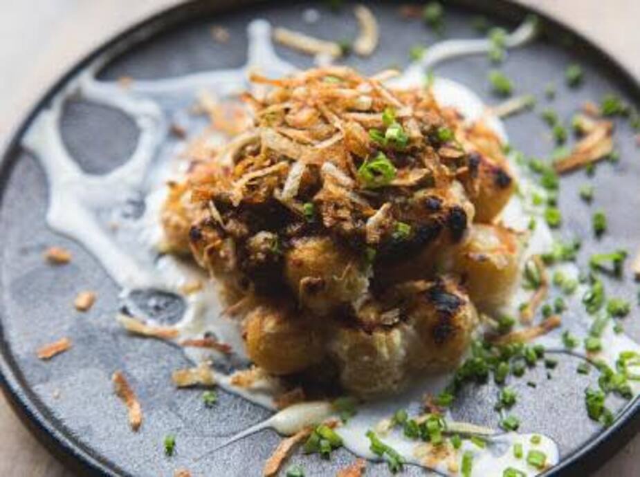 Flocons d'oignons frits, bacon, oignons verts et sauce joker à l’érable.