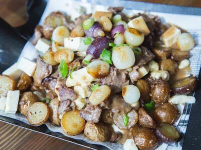 Patates grelots tricolores, rosbif, sauce au jus et bière Guinness, fromage en grains et cheddar, oignons perlés.