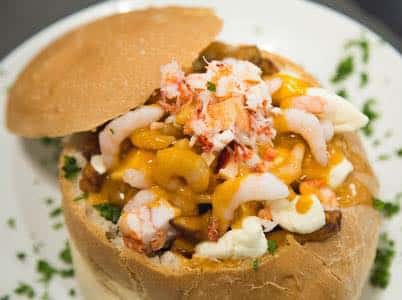 Succulentes crevettes de Matane, homard gaspésien, fromage en grains Kingsey, frites fraîches avec une sauce veloutée au BBQ servi en miche.