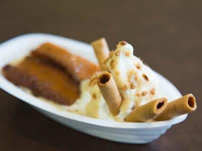 Crème glacée vanille recouverte de chocolat blanc à l’érable, de noisettes et de gaufrettes italiennes croquantes. Pour couronner le tout, nous avons ajouté une portion chaude du classique pouding chômeur québécois.