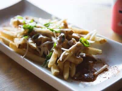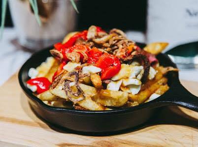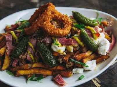 Frites maison, sauce à la bière Guinness, smoked meat, pepperoni, mini cornichon, échalotes, moutarde sucrée et garnie d’une rondelle d’oignon.
