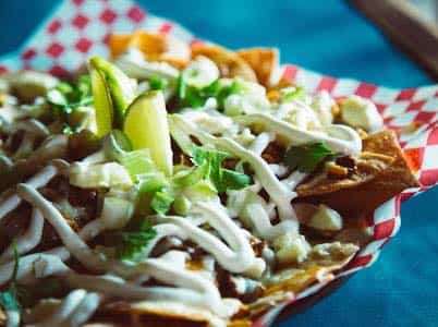 Chips de maïs maison, sauce chili, fromage en grains, coriandre, oignons verts, et crème sure. Le tout se mange sans ustensiles!