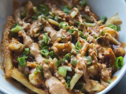 Fromage, sauce légèrement épicée, frites, poulet frit ainsi qu’oignons frits. * Photo non disponible