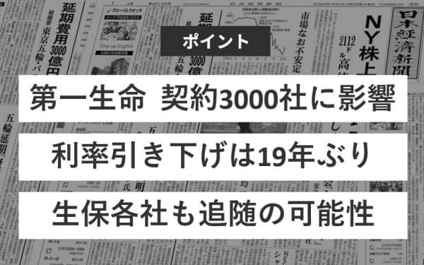 第一生命が企業年金の利率を引き下げるのは19年ぶりです。世界的に低金利の環境が続いており、第一生命に限らず約束した利回りを確保するのが難しくなっています。他の生保各社でも約束している利回り自体を引き下げる動きが強まる可能性が大きいです。